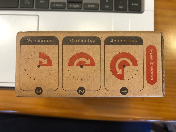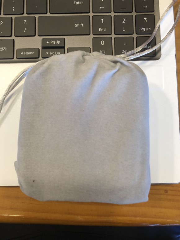 실제 사용하는 제품 구성 모습입니다. 본체와 충전선, 끈 이렇게 세 가지로 이루어져 있습니다.